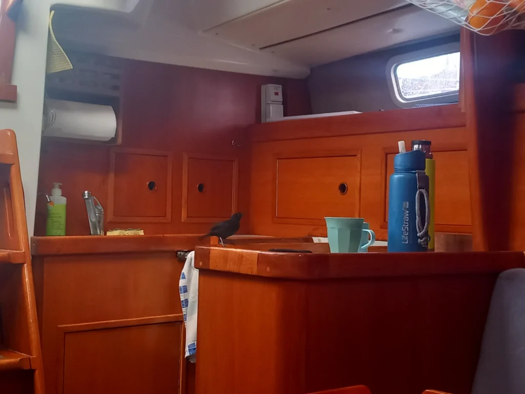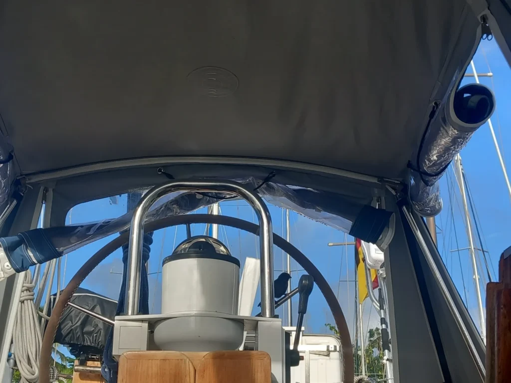 Beim Aufstieg auf den Mast wurde deutlich, dass eine Knickbeschädigung im Kabel am Windsensor vorlag. Wir mussten also ein neues Datenkabel auftreiben. Nach einer einstündigen Fahrt mit dem Bus zu einem Marine-Ausrüster bekamen wir ein neues Kabel, was jedoch mit 30 m viel zu lang war. Egal, Hauptsache, es funktioniert wieder. Also angeklebt und mittels des alten Kabels durch den Mast hindurchgezogen. Der frühere Verbindungsstecker lag außerhalb des Schiffs. Somit konnte Michele den Stecker nun im Inneren des Schiffes verlegen. Es war etwas umständlich, das 5-adrige Kabel an beiden Enden erneut zu klemmen. Am Ende hat es dann aber geklappt und der Windsensor liefert wieder Daten.