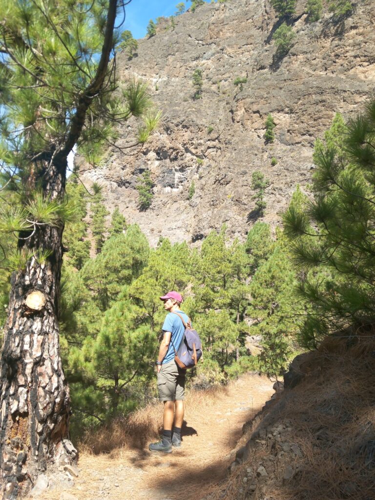 Um die Insel La Palma noch besser kennenzulernen, fuhren wir mit dem Bus in den Nationalpark Caldera de Taburiente, wo wir einen Stopp im Besucherzentrum machten. Anschließend ließen wir uns mit dem Taxi zu einem Aussichtspunkt im Nationalpark bringen, um von dort eine Wanderung durch den Kiefernwald zu unternehmen. Es ging entlang der Steilwände und bot immer wieder eine schöne Aussicht über das Tal.