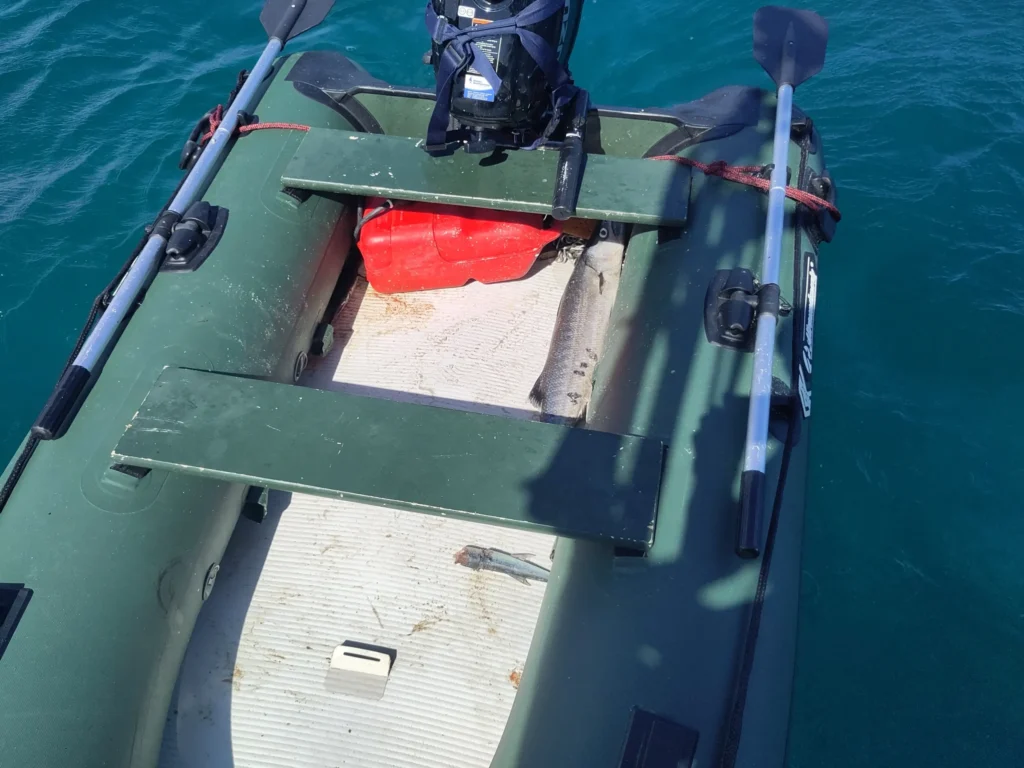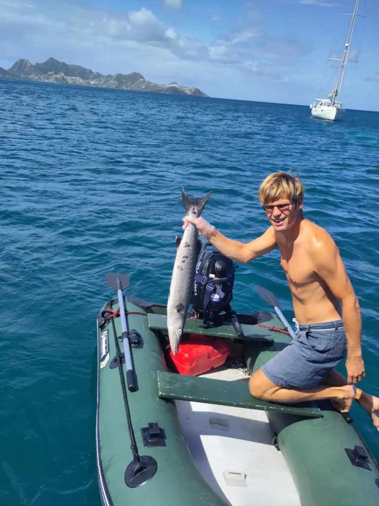 Am dritten Tag fuhren wir zur Insel Mayreau. Sie ist ebenfalls ein Teil des Marineparks. Allerdings ist diese Insel bewohnt. Dort verbrachten wir ein paar Tage in der Ankerbucht Saline Bay. Eines Morgens habe ich die Reste einer Fischjagd im Dinghy gefunden. Ein Barrakuda hat einen anderen Fisch aus dem Wasser gejagt und ist hinterher gesprungen. Leider war beim Landen das Dinghy im Weg.